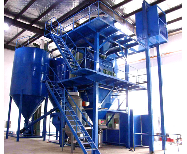 原料倉(cāng),自動(dòng)計(jì)量配料及稱重裝置,斗式提升機(jī),待混倉(cāng),高效混合機(jī),喂料機(jī),成品倉(cāng),自動(dòng)稱量包裝機(jī),脈沖除塵器,支架爬梯平臺(tái),電器控制柜等組成。